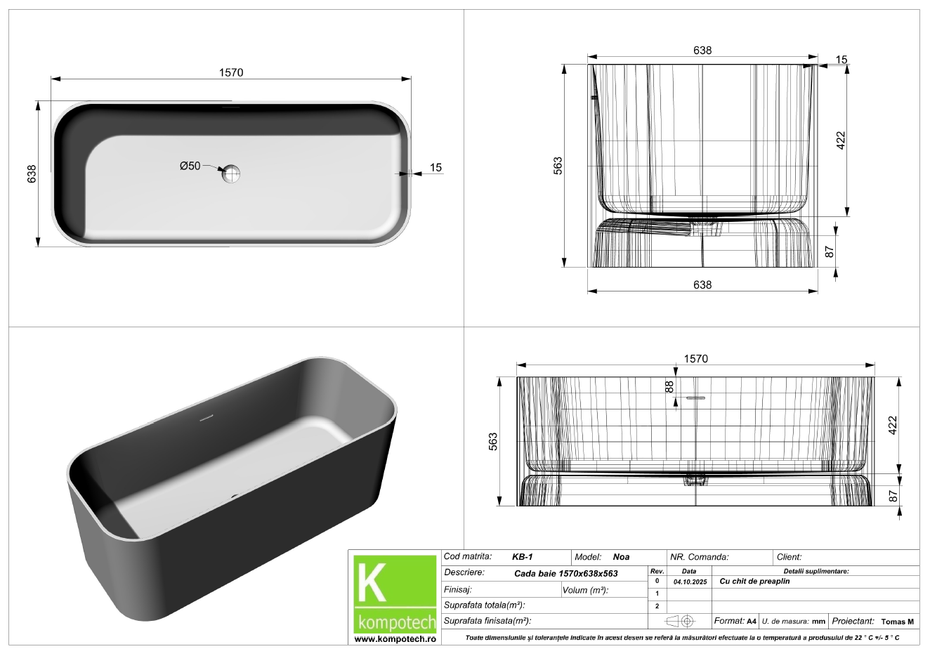 - Dimensiuni: 1570x638x563 – ideală pentru băile de dimensiuni reduse sau spații compacte